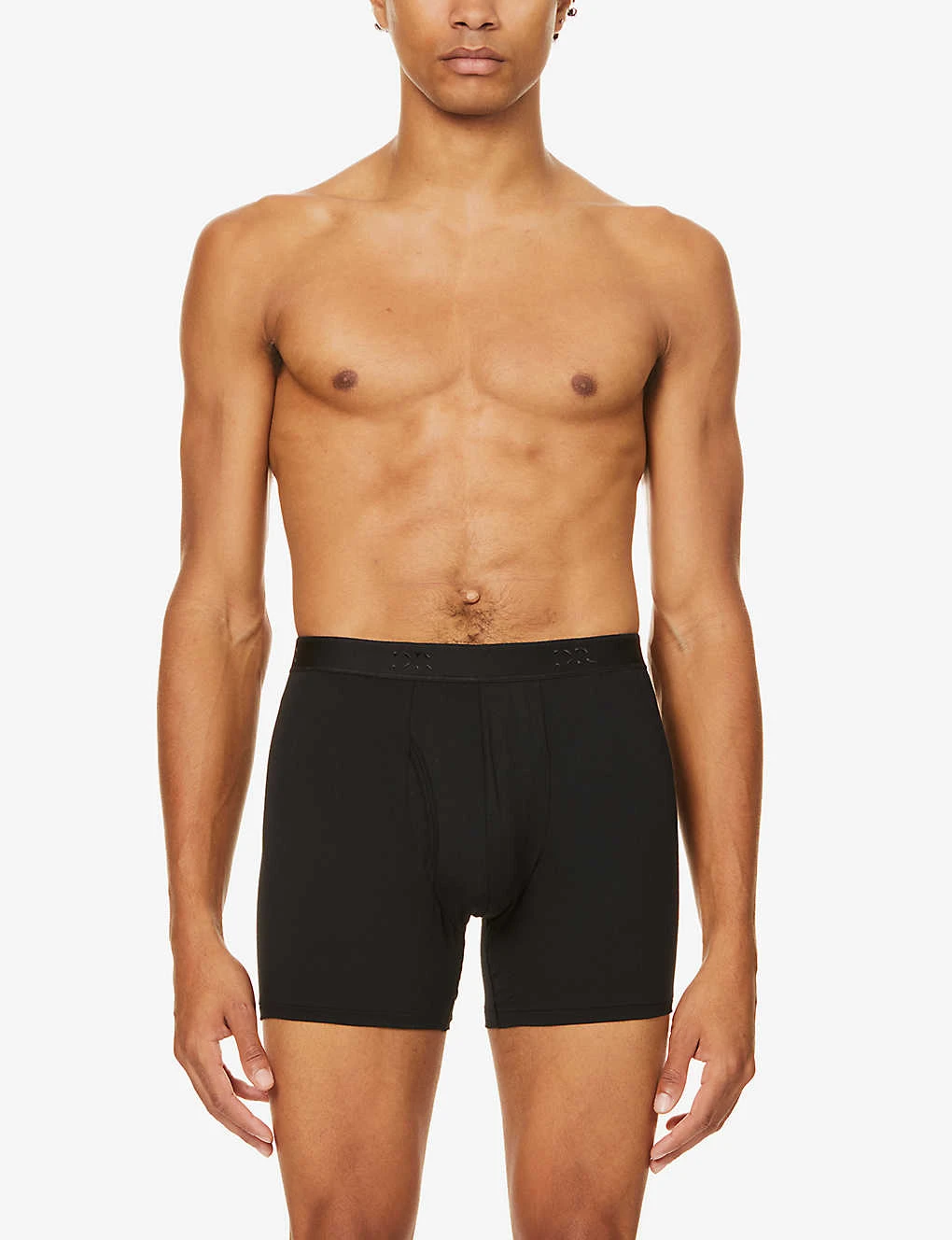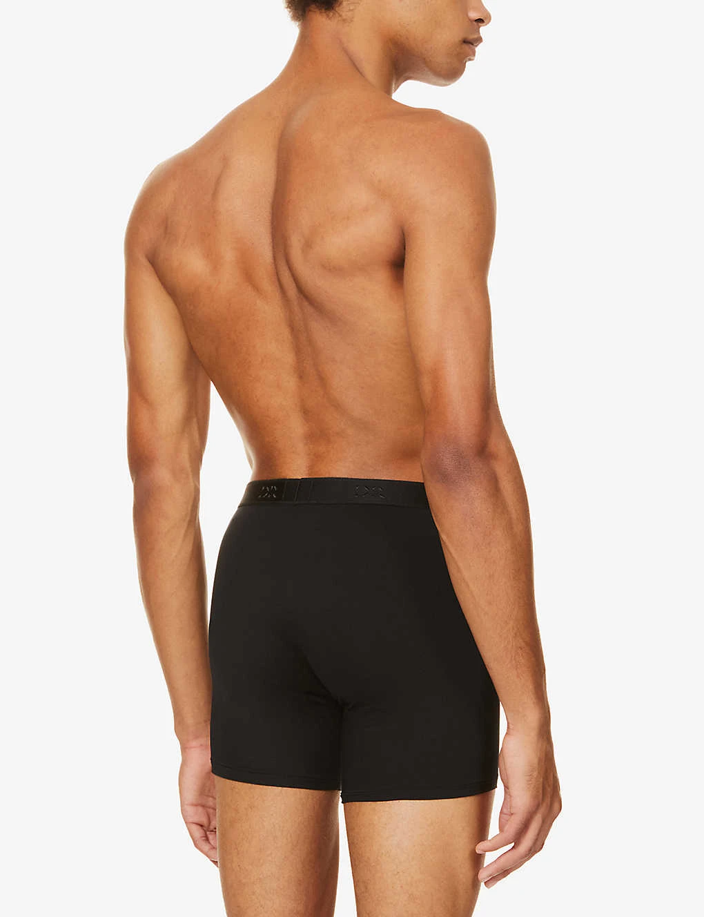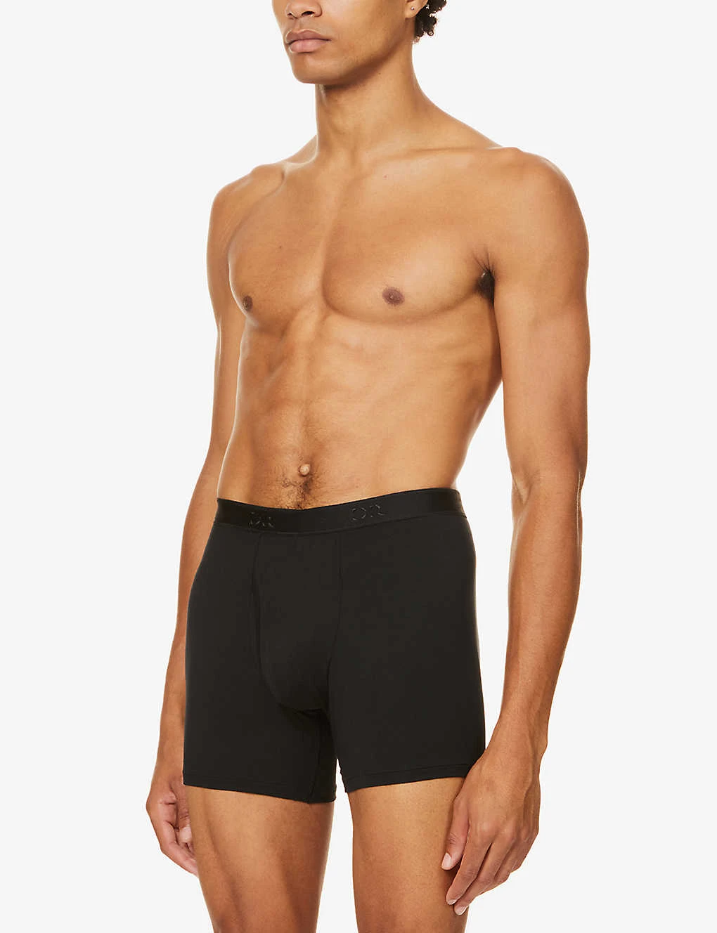 Derek Rose stretch trunks Pulls on Regular-fit, mid-rise, logo-print elasticated waistband, lightweight fabric 94% modal, 6% elastane Machine wash Size large: Waist 30″”, inside leg 2″” Model is 6ft and wears a size large