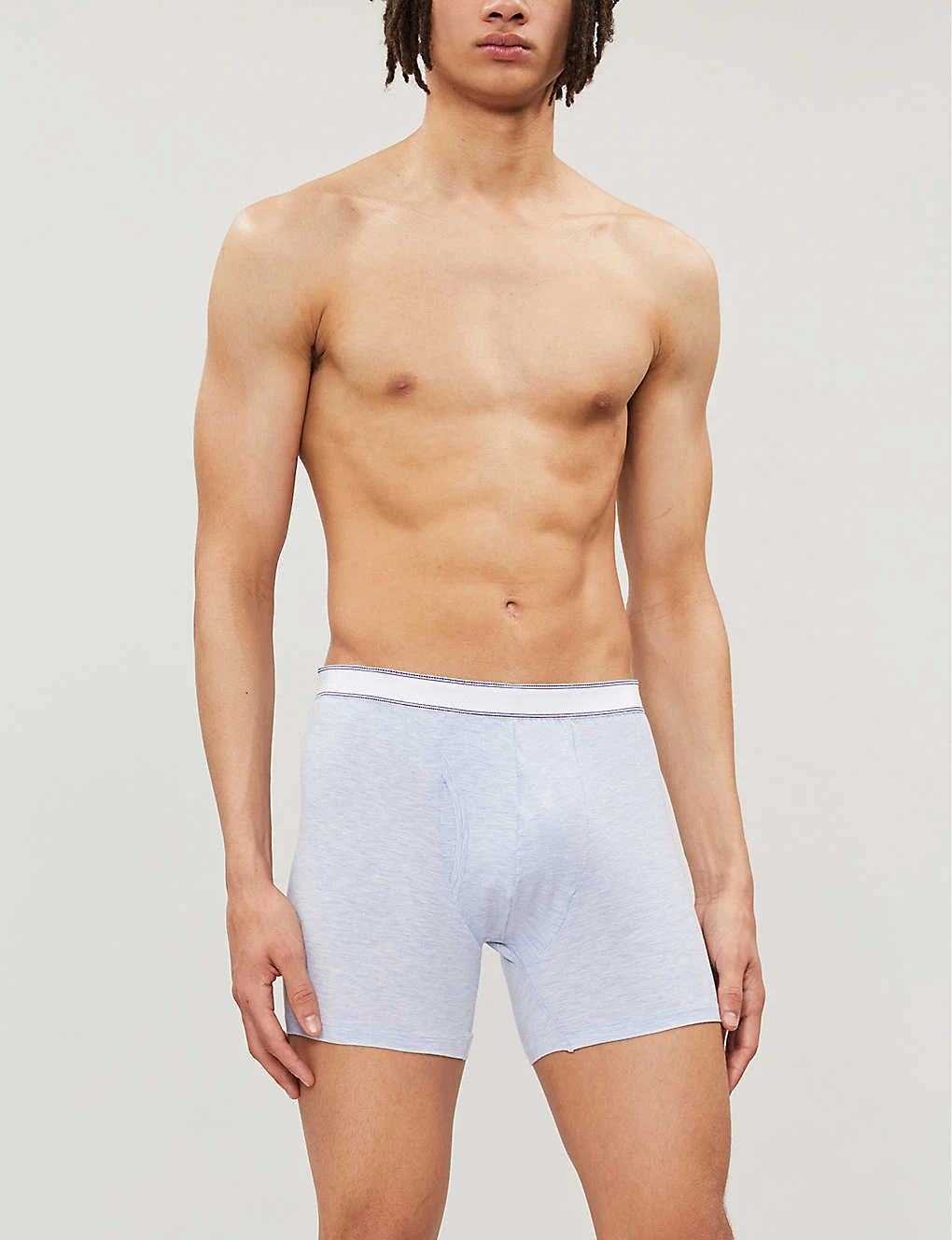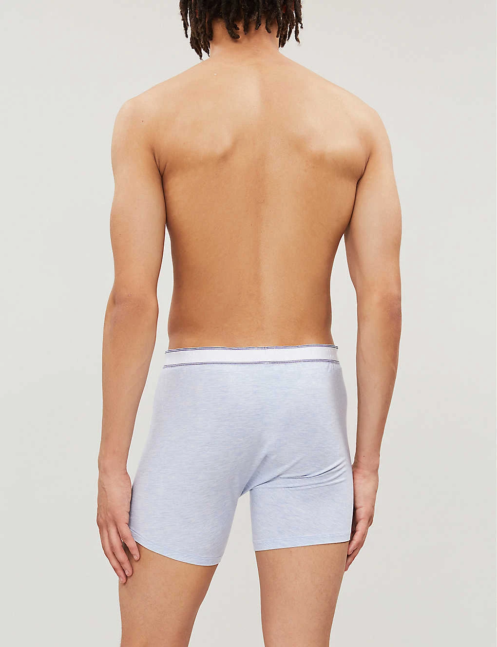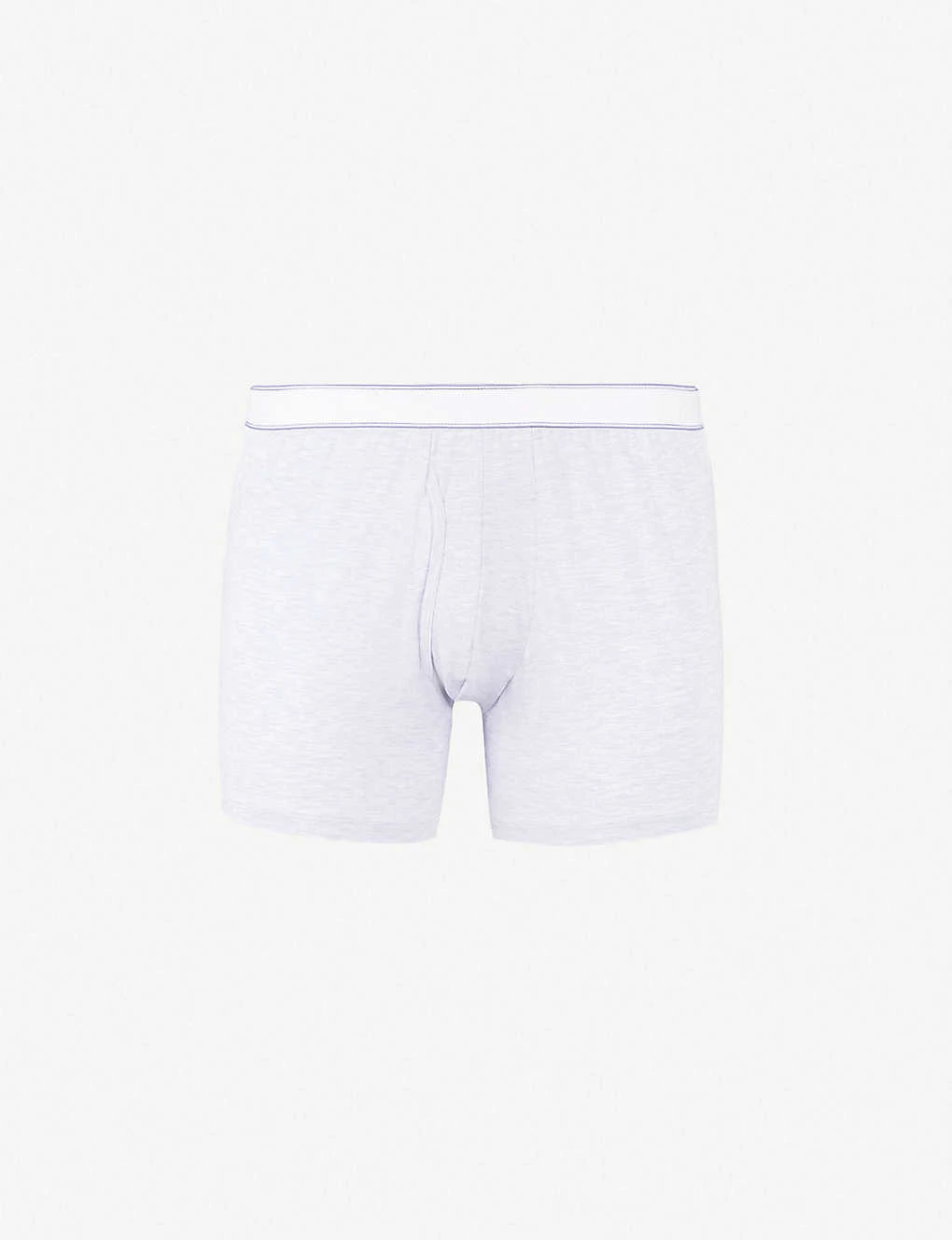 Derek Rose stretch trunks Pulls on Regular-fit, mid-rise, contrasting elasticated waistband, half-open supportive centre-front pouch, lightweight fabric 91% modal, 9% elastane Machine wash Size large: Waist 30″”, inside leg 3.5″” Model is 6ft and wears a size large