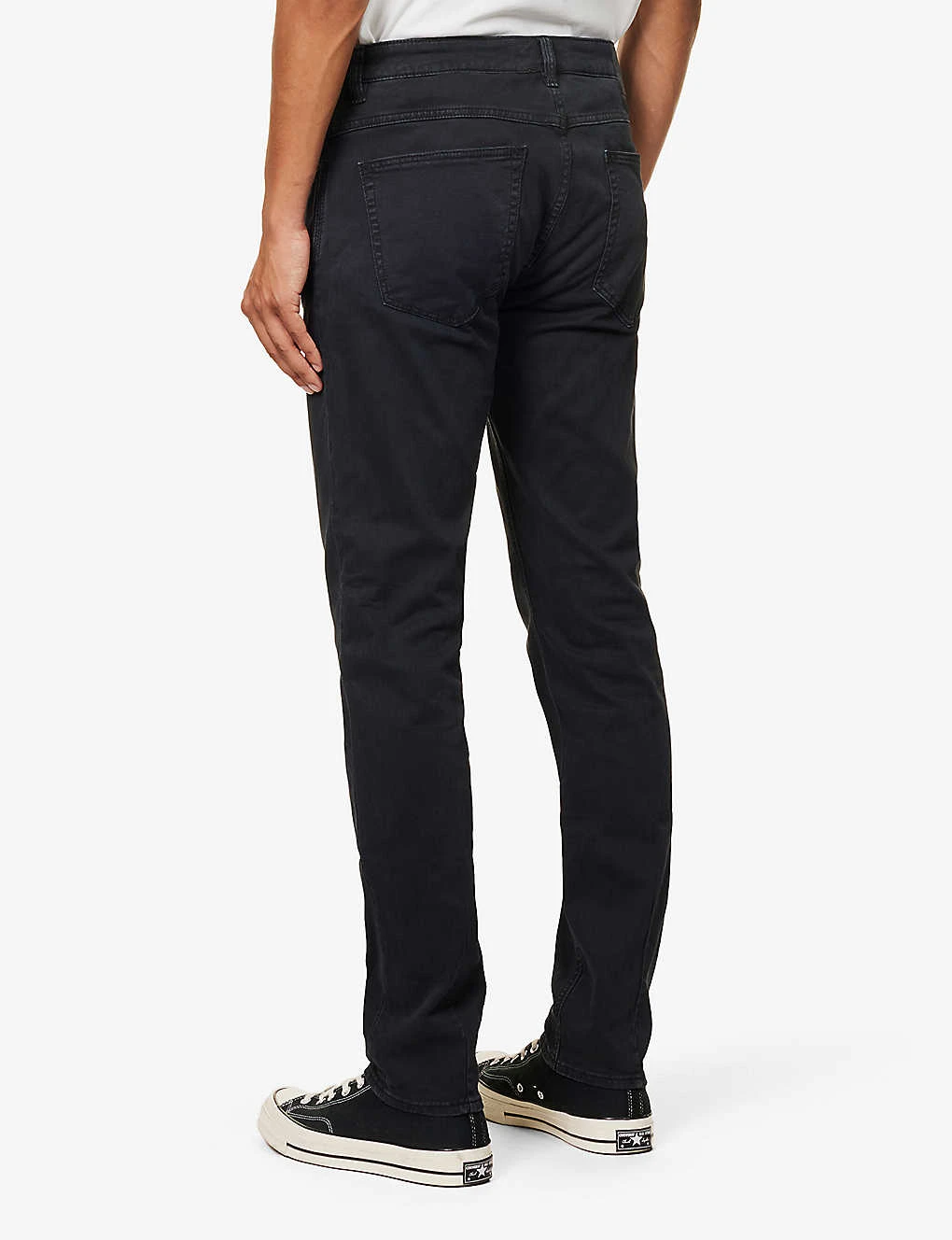 - Slim fit, straight leg, mid rise, belt loops, branded hardware, five pockets, branded patch at back, all-over twill texture, partially lined