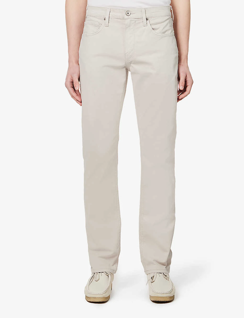 - Exposed button and concealed zip-fly fastening at front