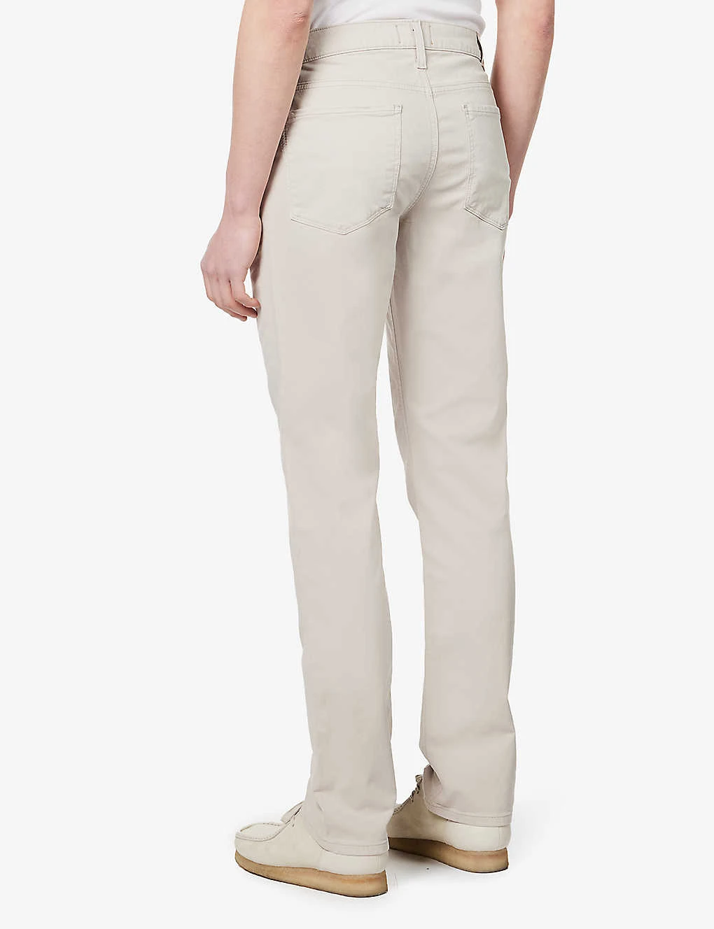 - Slim fit, mid-rise, straight leg, structured waistband with belt loops, five pockets, brand patch at back, curved yoke at back, branded silver-toned hardware
