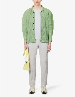 - Regular fit, mid-rise, dropped crotch, elasticated drawstring waistband, two slip pockets at sides, concealed button-fly at front, all-over pleated pattern, partially lined