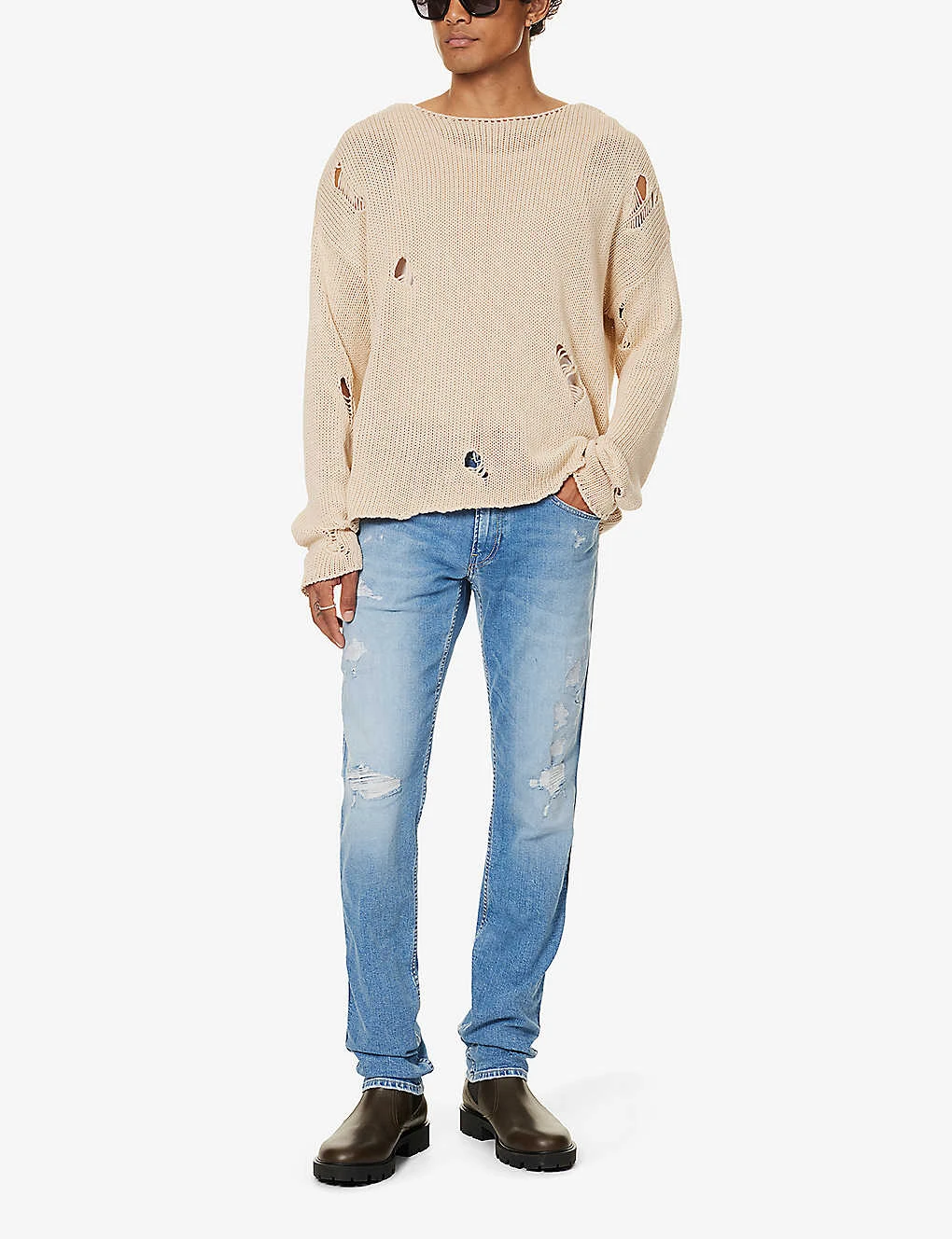 - Regular-fit, mid-rise, straight leg, belt loops, five pockets, branded silver-toned hardware, all-over distressed panels and ripped at front, faded wash and whiskering, embroidered brand tab at front, branded patch at back, V-shaped yoke at back, partially lined