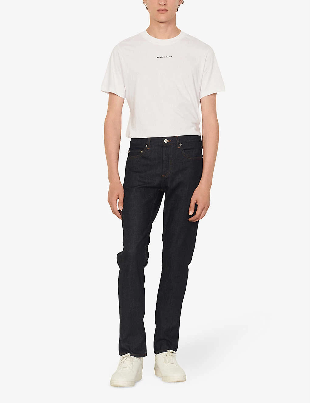 Sandro stretch-denim jeans Exposed button and concealed button-fly fastening at front Regular-fit, tapered, mid-rise, contrast stitching, belt loops, five pockets, branded silver-toned hardware, branded leather patch at back waistband, v-shaped yoke at back 99% organic cotton, 1% elastane Machine wash Size 32: Rise 10″”, inside leg 30″”, leg opening 14″” Model is 6ft and wears a size 32