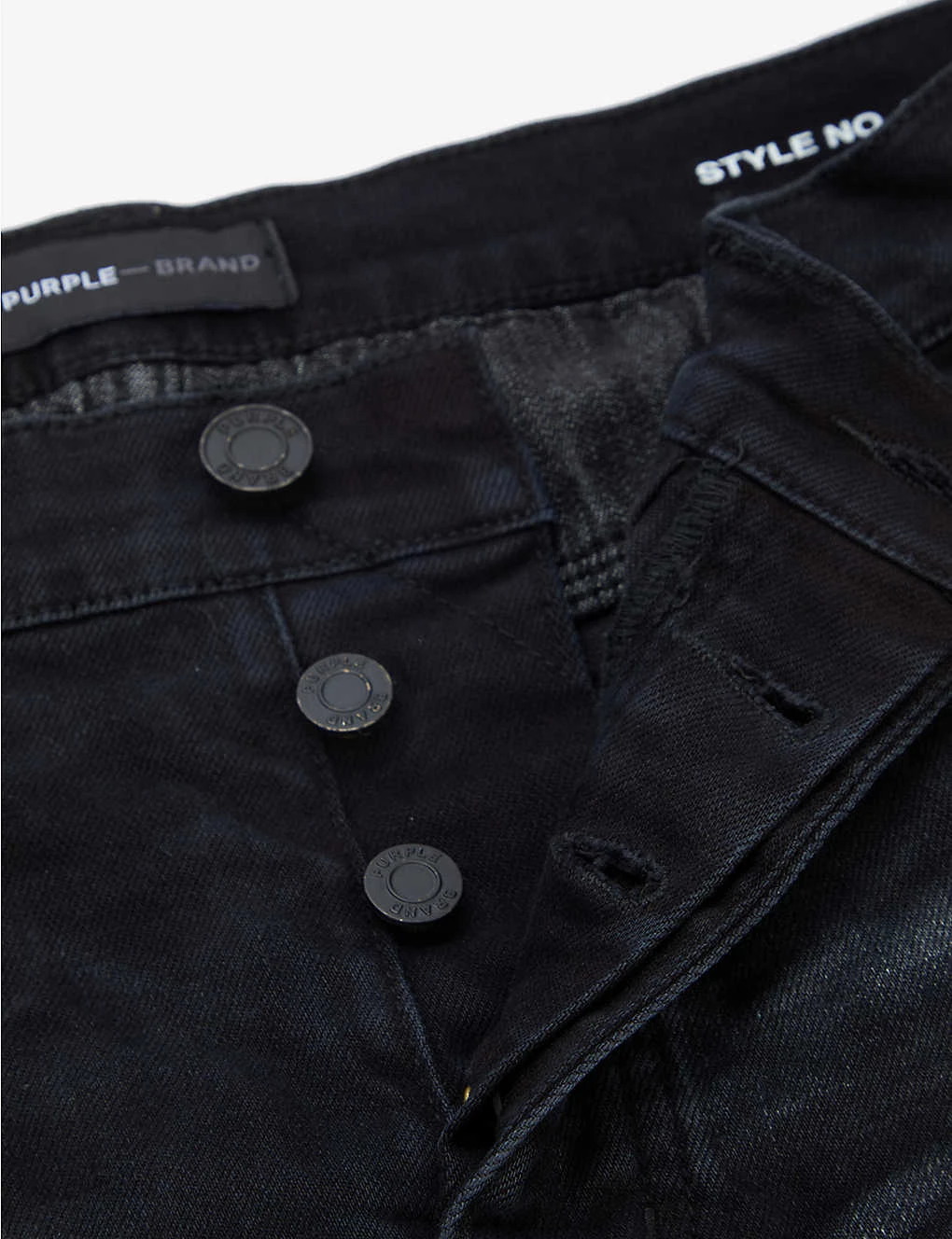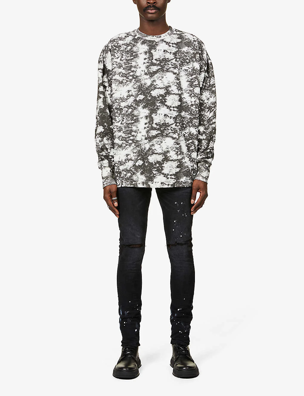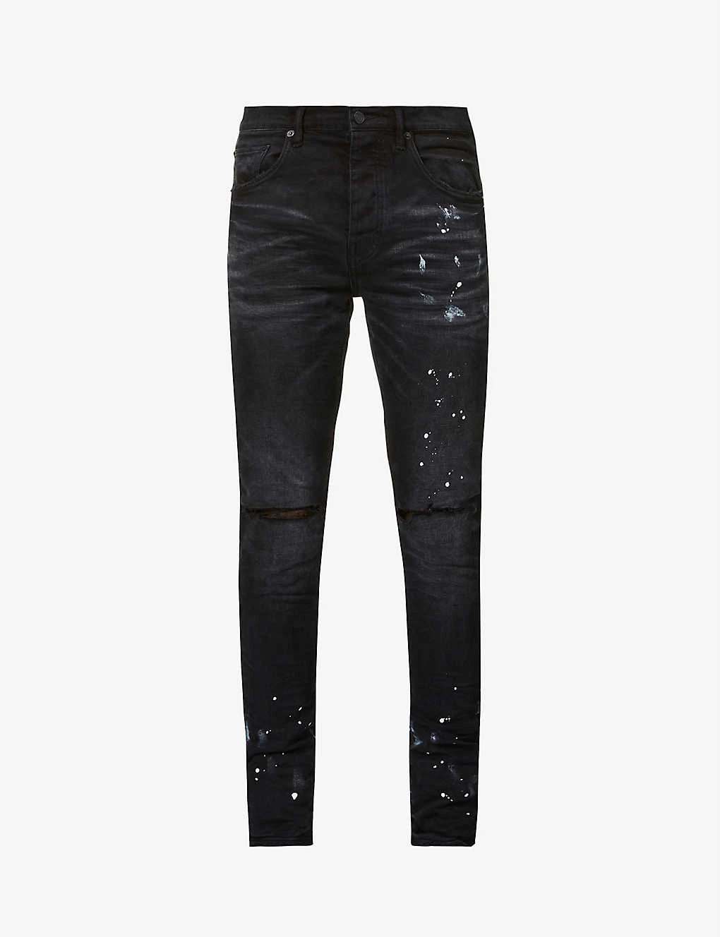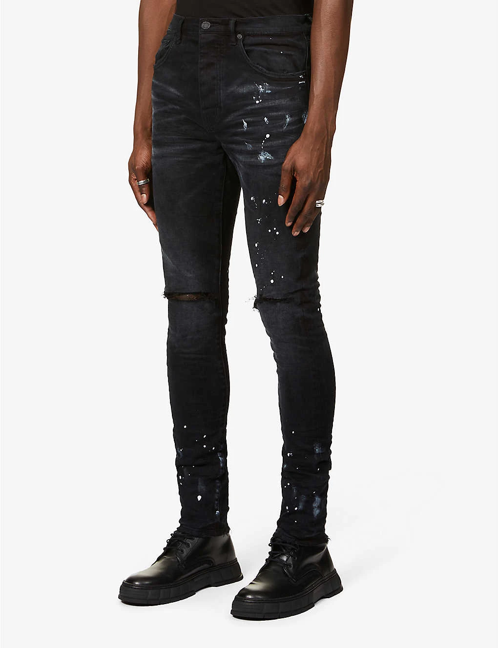 - Slim fit, mid-rise, skinny leg, belt loops, five pockets, faded wash, ripped pattern, crinkled texture, all-over paint splash pattern, branded patch at back waistband, v-shaped yoke at back