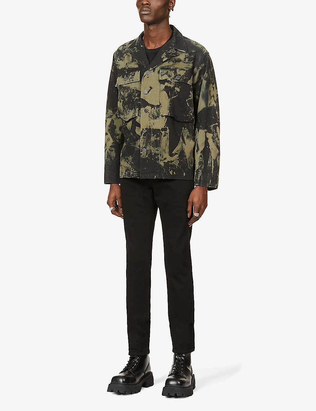 - Exposed button and concealed zip-fly fastenings at front