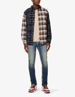 - Relaxed fit, mid rise, skinny leg, belt loops, five pockets, ripped, brand patch at back waistband, V-shaped yoke at back